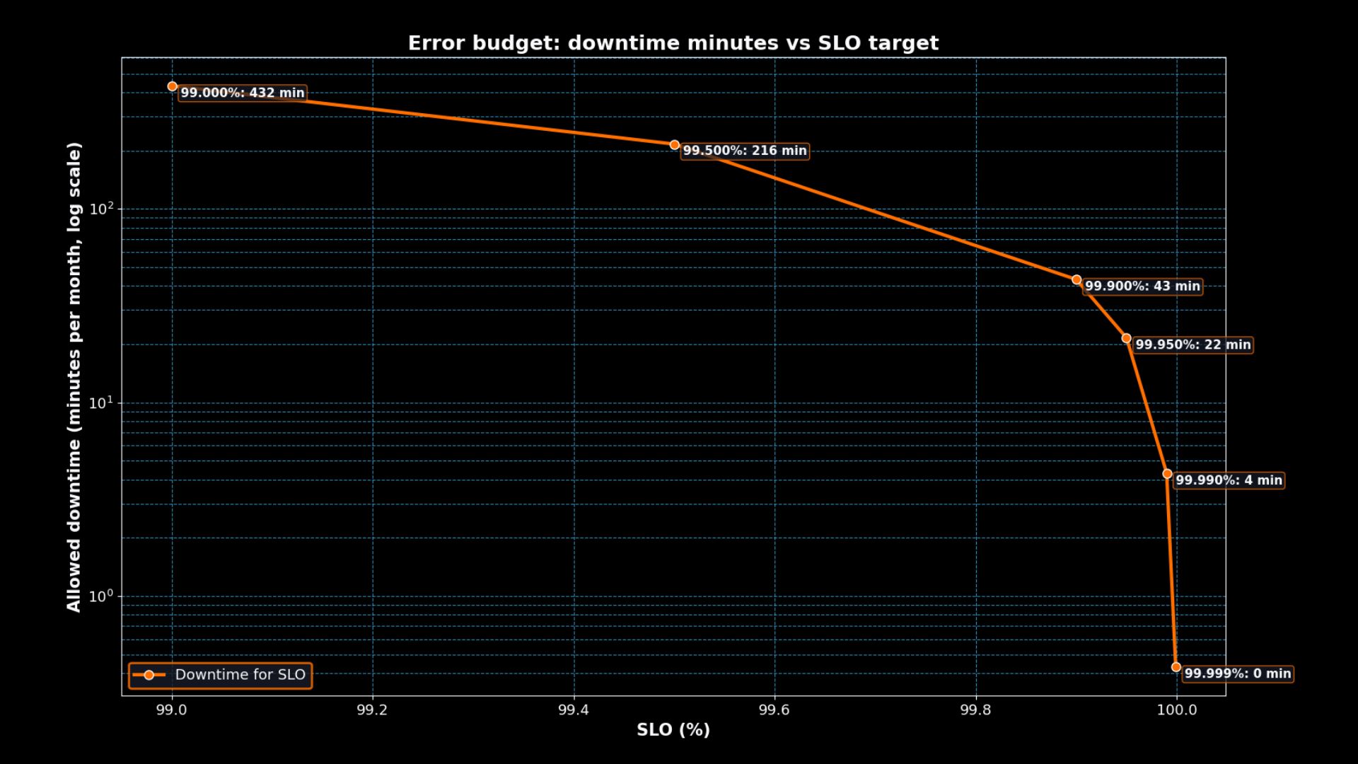 The log-scale graph highlights the steep drop. Moving from 99.9% to 99.99% uptime reduces the monthly error budget from ~43 minutes to just over 4 minutes. Each extra “nine” is a huge jump in cost and complexity for very little additional allowance.
