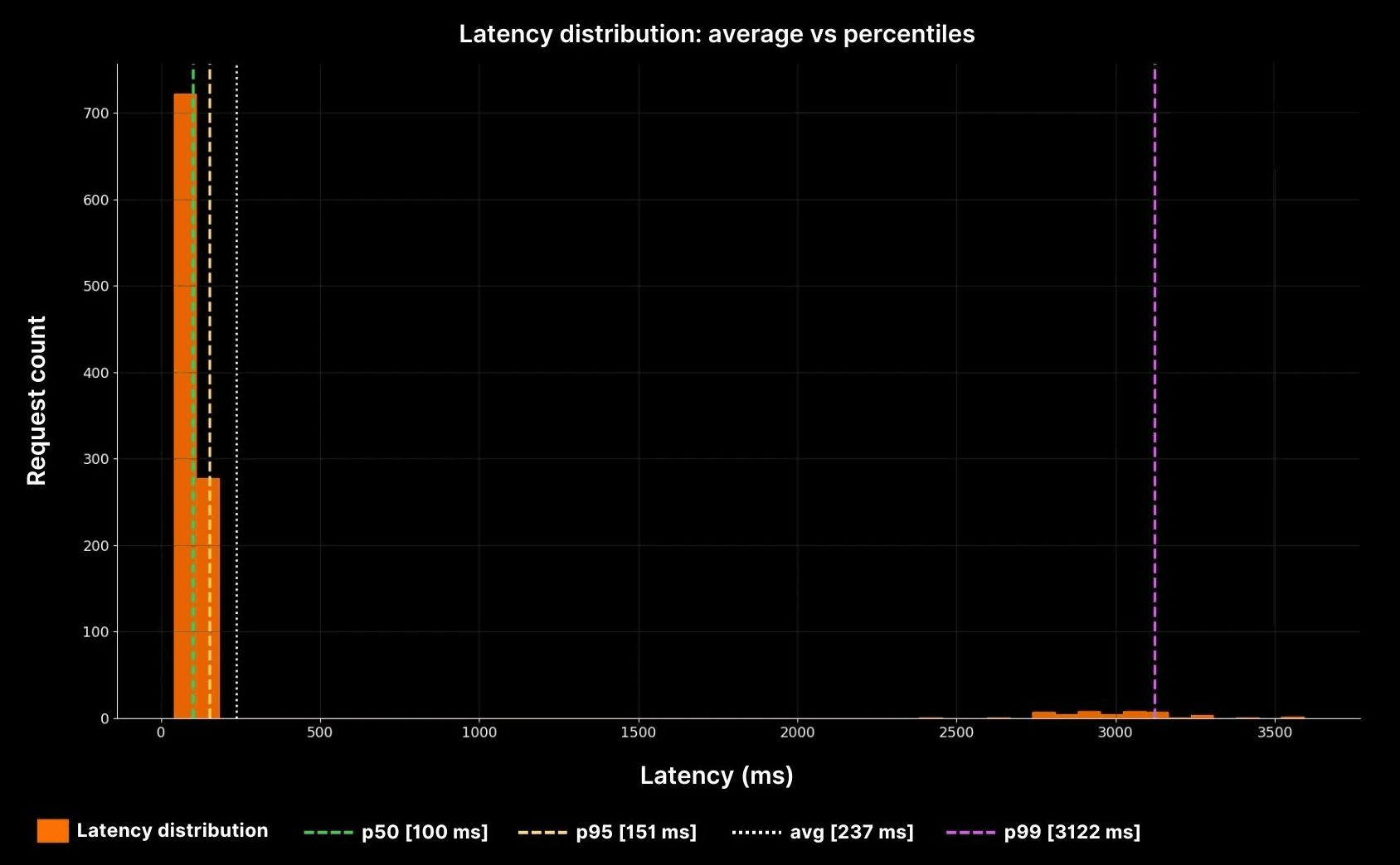 Imagine a checkout service. In one minute it serves 1,000 requests around 100 ms and 50 requests that take 3 seconds. The average is ~250 ms. The line is flat, calm, and looks acceptable. But 50 customers just waited three seconds to pay. Some retried, some gave up. Those are the customers whose voices fill Slack and Jira tickets.