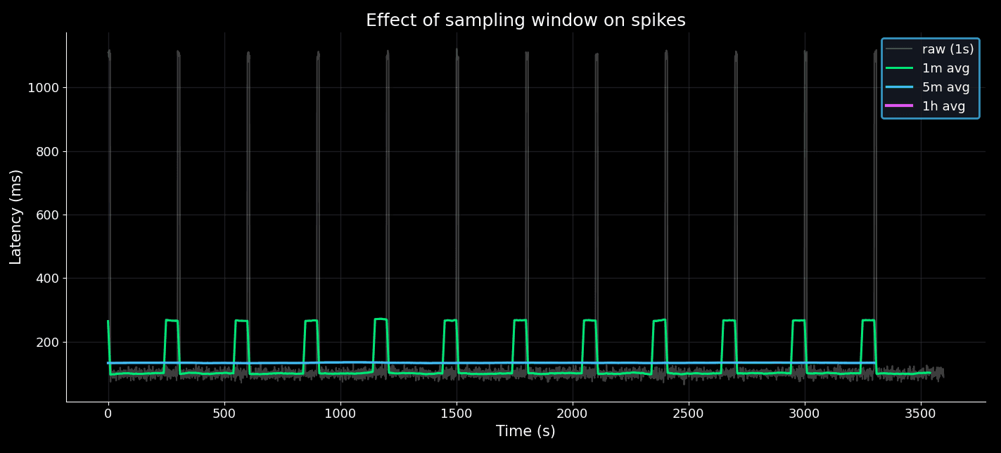 Short windows expose spikes. Long windows smooth them away. For outages, always zoom to 10 to 30 second windows. For planning, 1 hour or 1 day windows are fine. Misreading windows is one of the most common failure modes during triage.