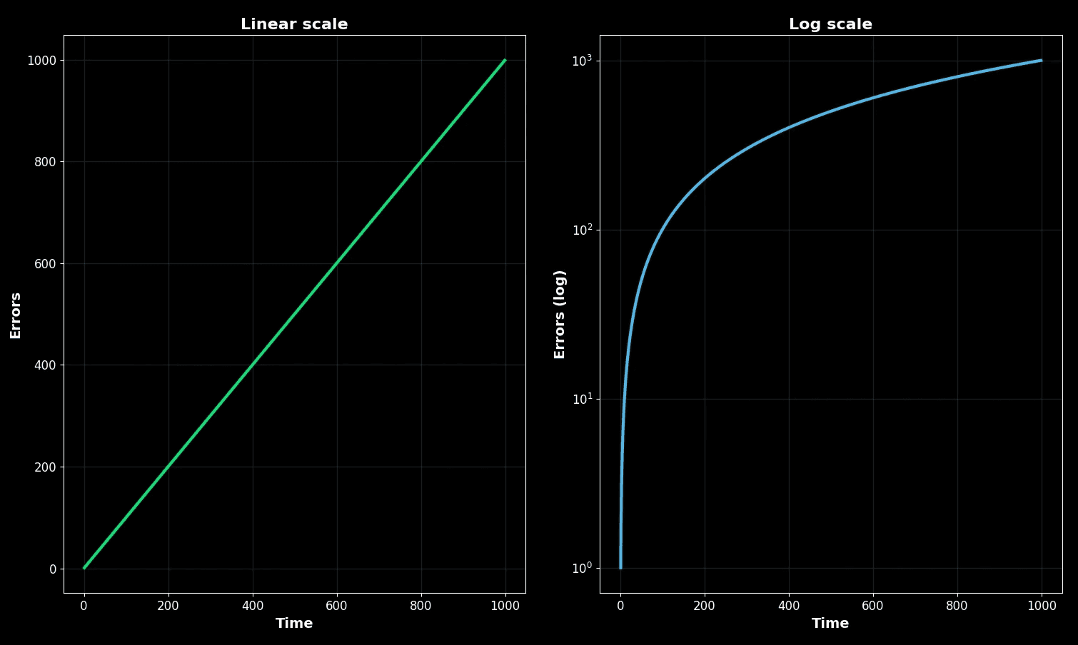 On the left, the linear scale shows a steady climb. On the right, the log scale flattens the same climb. Both are correct mathematically, but only one matches what users feel.