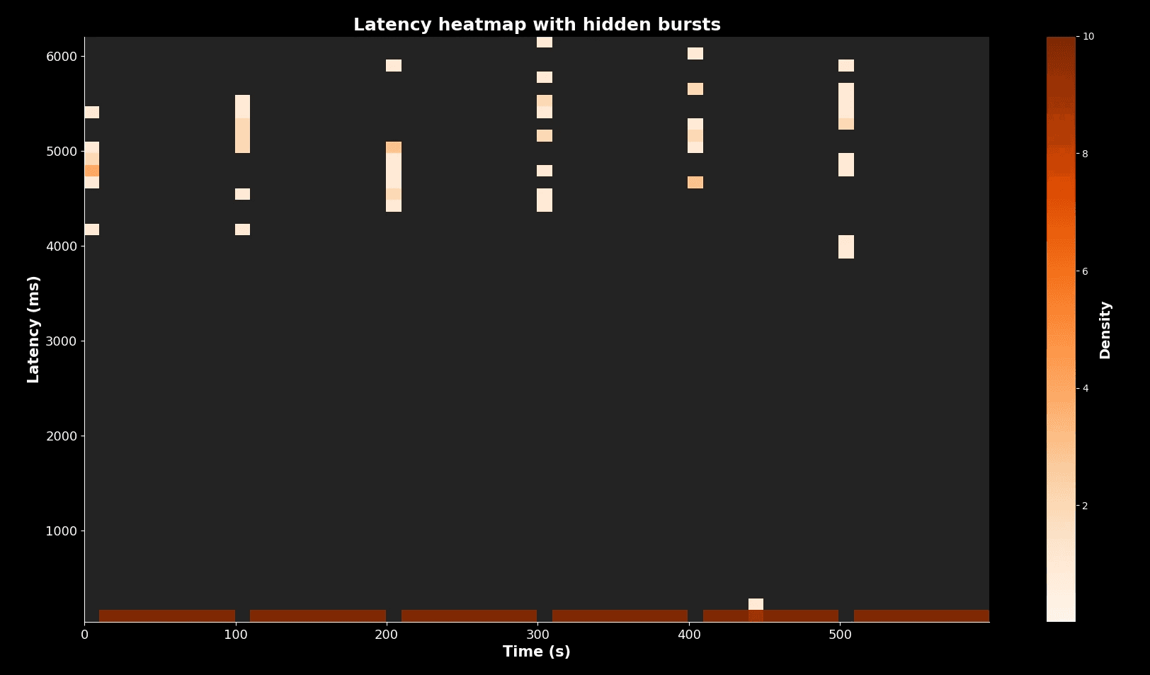 Most requests cluster in the dark band at 100 ms. But the faint vertical streaks every 100 seconds show bursts at 5,000 ms. Without care, an engineer could ignore them. With percentiles or absolute counts, you see that these are real users suffering.