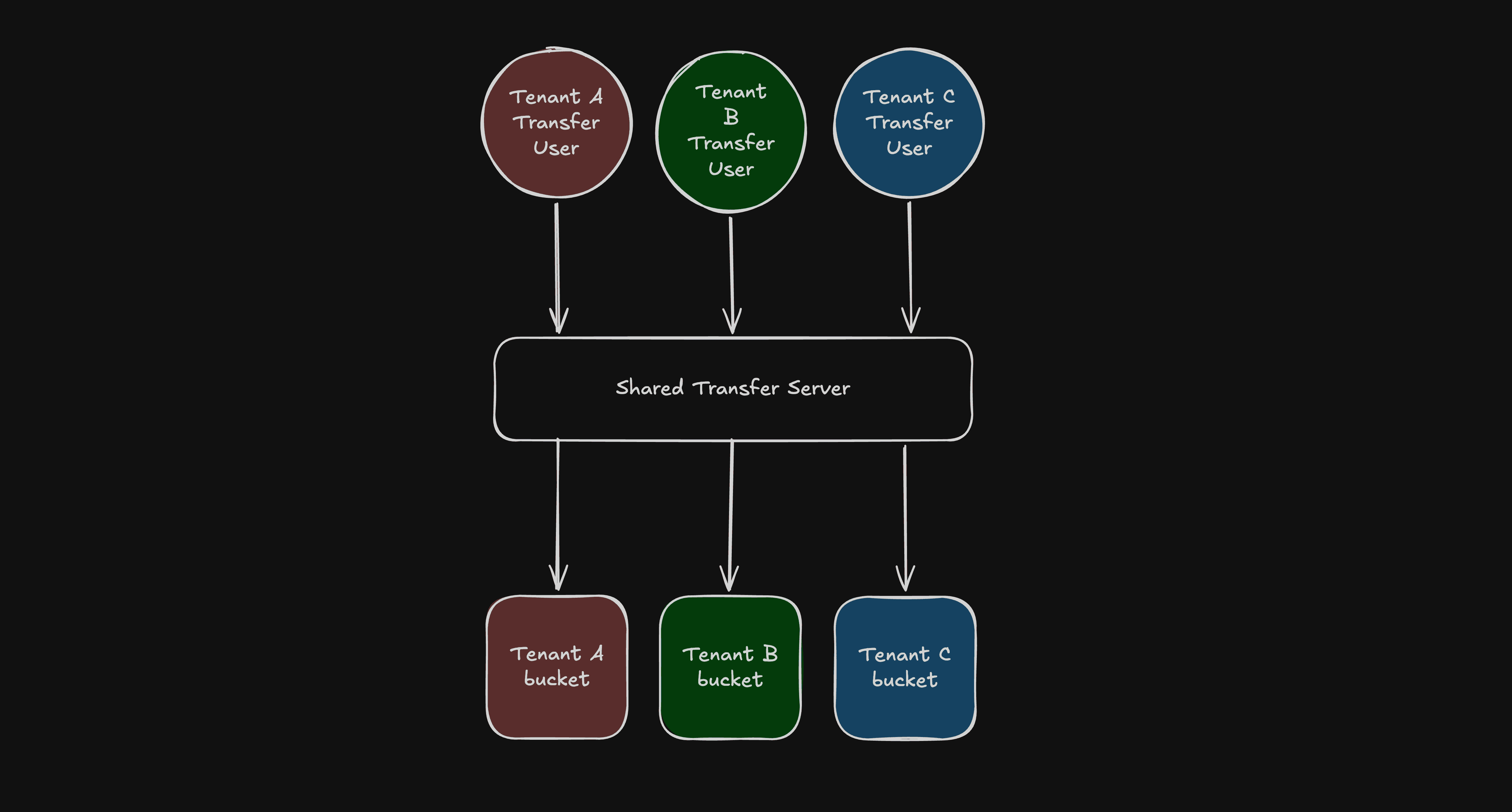 From the tenant’s perspective, they connect to one SFTP endpoint and only see their own files. Behind the scenes, they are isolated by separate storage and permissions.