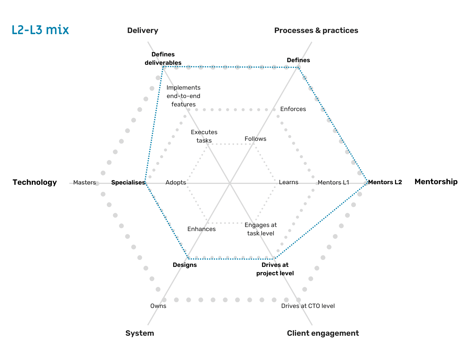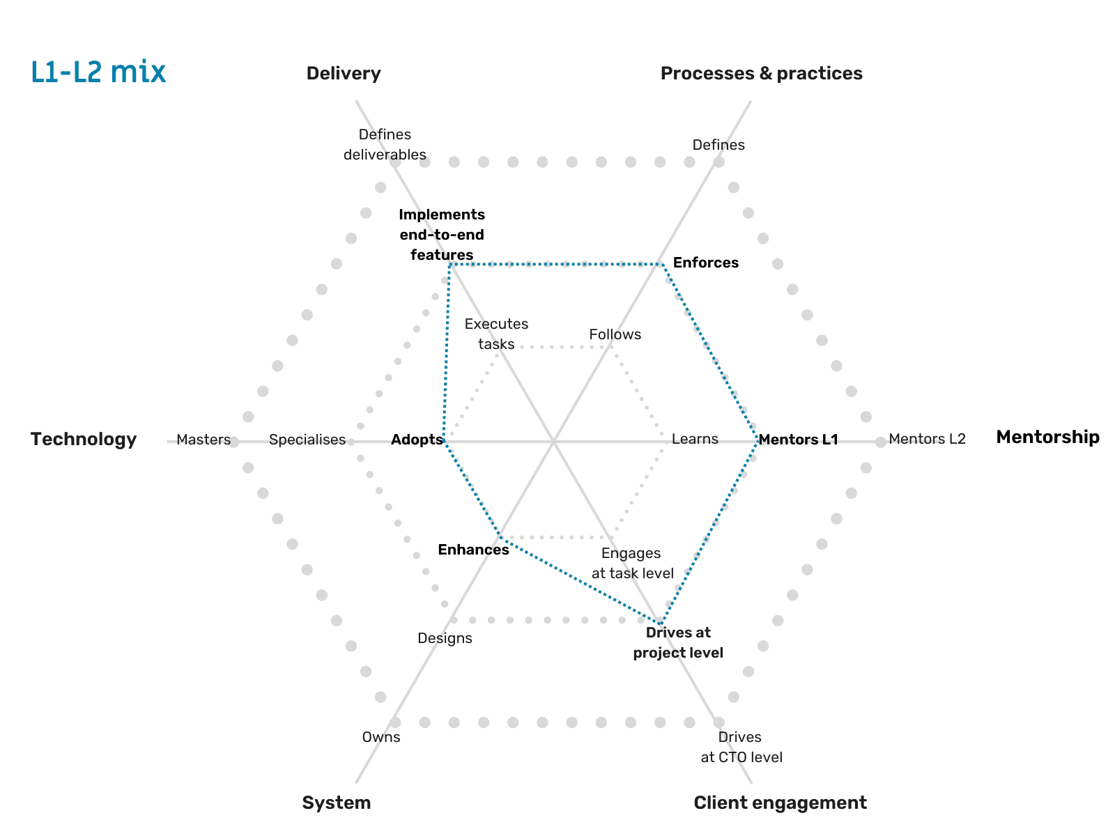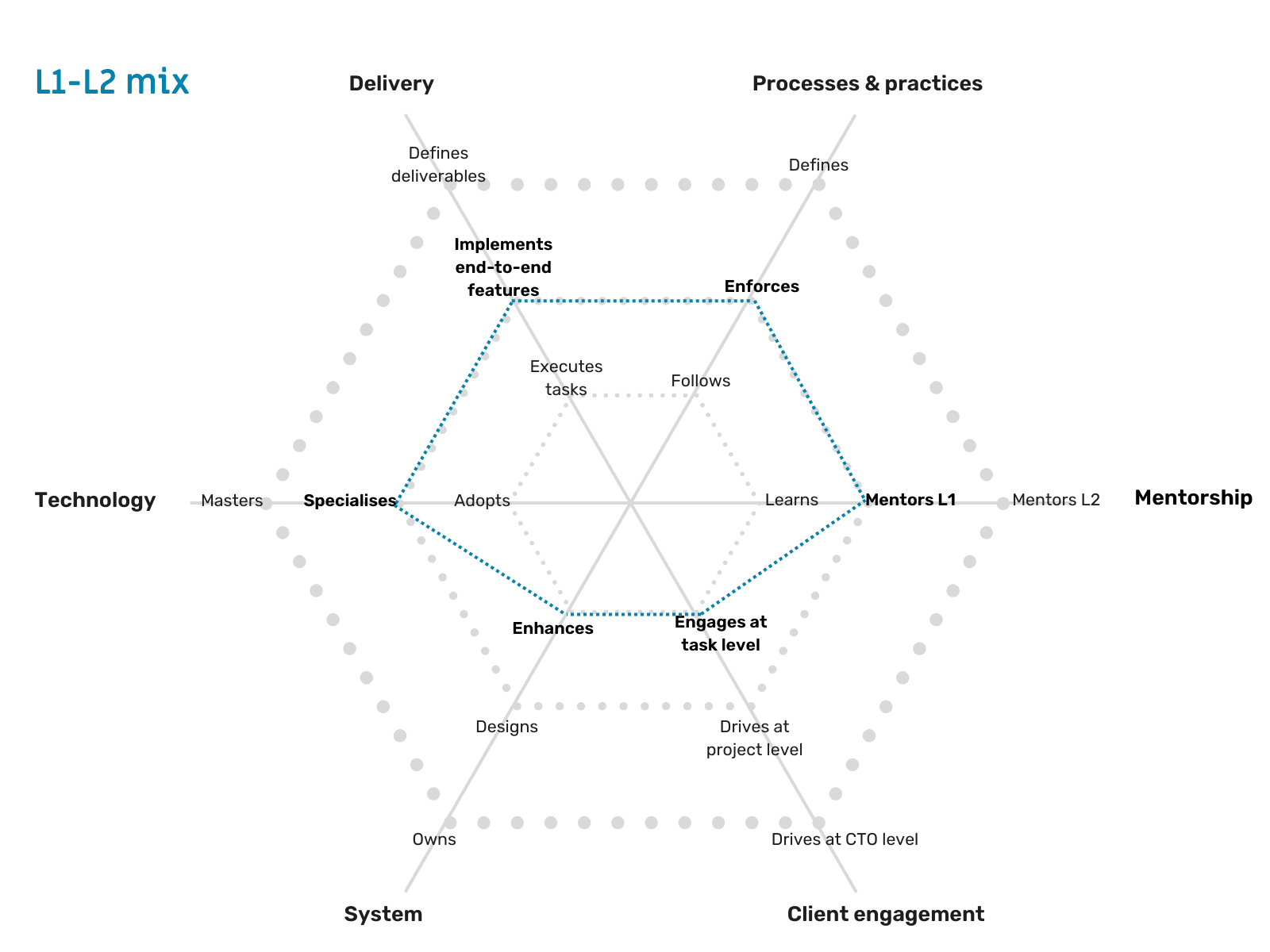 In short, in such cases, the One2N leadership will review how many areas you have grown in, how much, and in which areas you are still at a lower level, and then decide whether you deserve a promotion. Usually, no one grows on all expectations simultaneously. You grow on a few expectations earlier and on other expectations later. For e.g., you might have the skills to mentor your teammates on best practices and unblock them when needed (i.e, you are L2 here), but you may not have the communication skills yet to question your clients or provide them with suggestions (i.e., you are still at L1 here).