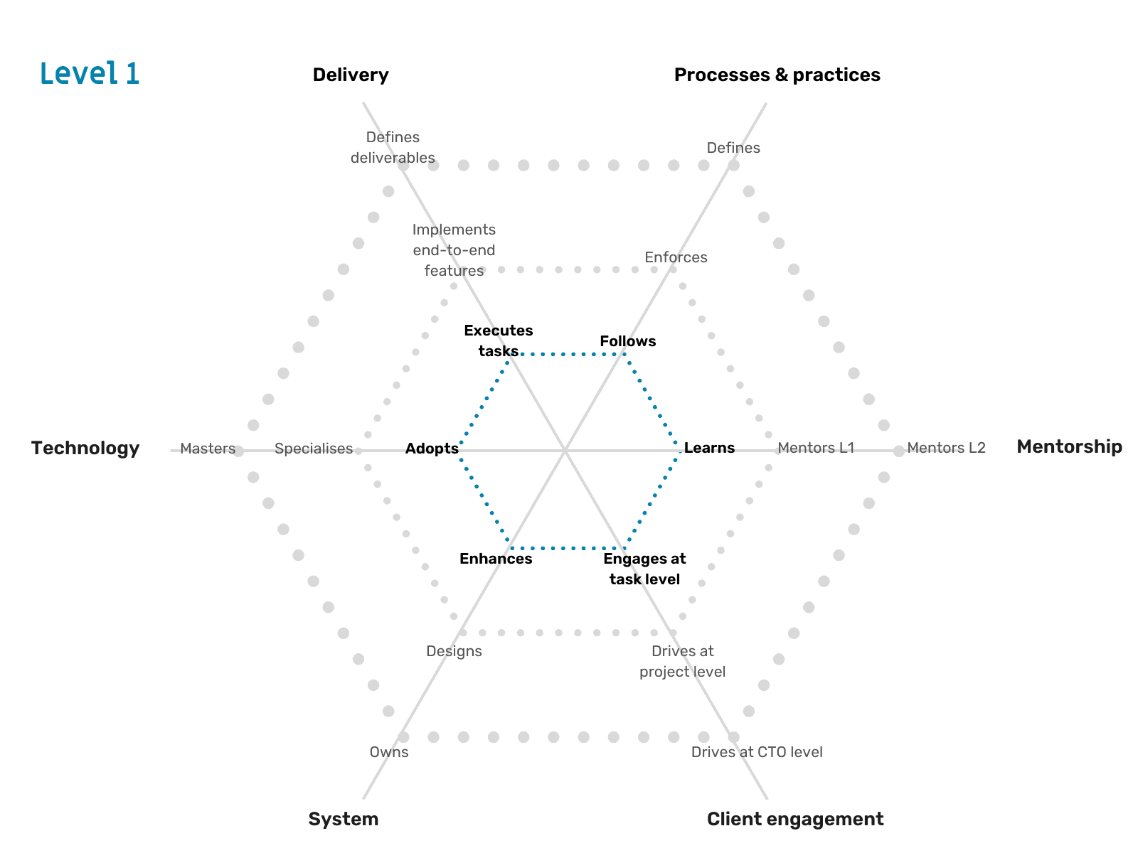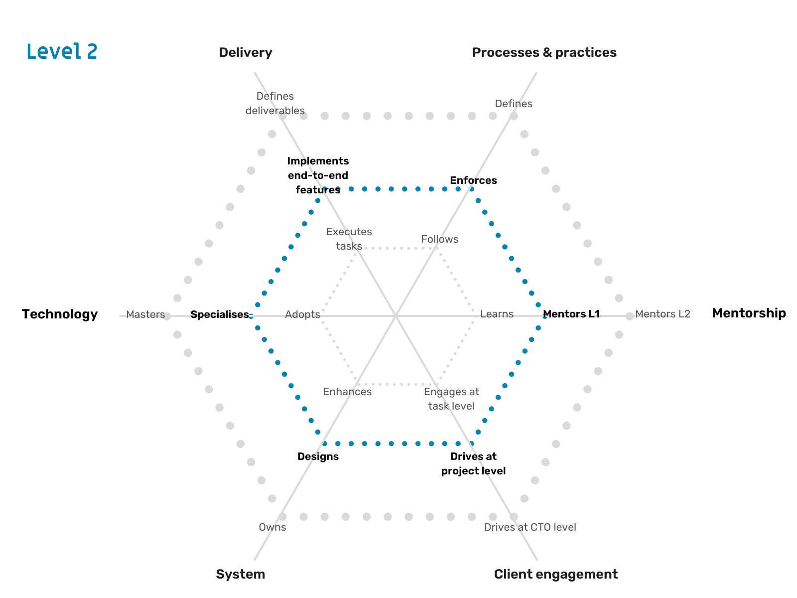 - By being good at your own level first - At the very least, you need to meet the expectations that One2N has from you at your level. Are you consistently doing your tasks as per the expectations laid out by One2N? Are you consistently demonstrating our core values while doing these tasks? The answer to both these questions has to be a resounding Yes from you, your teammates, your clients, and the One2N leadership.